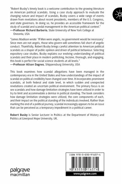 This book examines how scandal allegations have been managed in the contemporary era in the United States and how understandings of the impact of scandal on political credibility have changed over time. It incorporates prominent scandals, at both federal and state level, in which sudden and unexpected revelations created an uncertain political environment. The primary focus is on sex scandals and how damage limitation strategies have been utilized in order to try to limit and accommodate a demise in political standing. The book considers how damage limitation strategies were utilized, the core components of each, and their impact on the political standing of the individuals involved. Rather than marking the end of a political journey, scandal increasingly appears to be an issue that can be perceived as a temporary impediment in a political career.