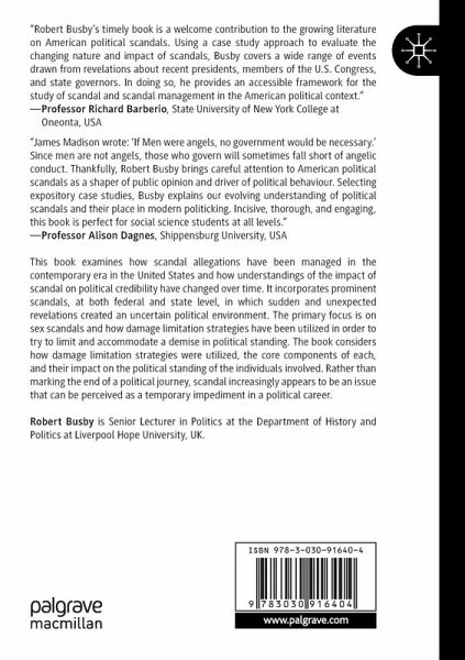 This book examines how scandal allegations have been managed in the contemporary era in the United States and how understandings of the impact of scandal on political credibility have changed over time. It incorporates prominent scandals, at both federal and state level, in which sudden and unexpected revelations created an uncertain political environment. The primary focus is on sex scandals and how damage limitation strategies have been utilized in order to try to limit and accommodate a demise in political standing. The book considers how damage limitation strategies were utilized, the core components of each, and their impact on the political standing of the individuals involved. Rather than marking the end of a political journey, scandal increasingly appears to be an issue that can be perceived as a temporary impediment in a political career.