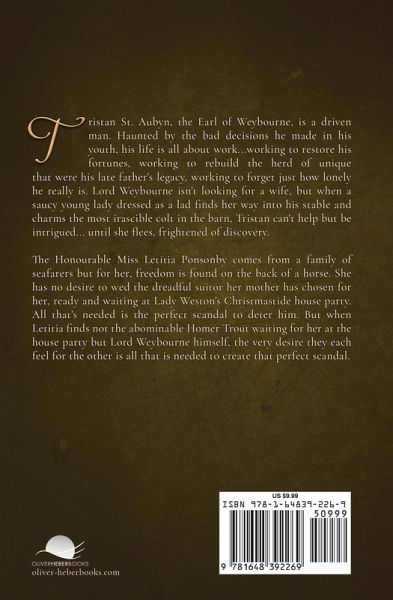A Christmas novella from New York Times and USA Today bestselling author Danelle Harmon! Tristan St. Aubyn, the Earl of Weybourne, is a driven man. Haunted by the bad decisions he made in his youth, his life is all about work ... working to restore his fortunes, working to rebuild the herd of unique racehorses that were his late father's legacy, working to forget just how lonely he really is. Lord Weybourne isn't looking for a wife, but when a saucy young lady dressed as a lad finds her way into his stable and charms the most irascible colt in the barn, Tristan can't help but be intrigued... until she flees, frightened of discovery. The Honourable Miss Letitia Ponsonby comes from a family of seafarers but for her, freedom is found on the back of a horse. She has no desire to wed the dreadful suitor her mother has chosen for her, ready and waiting at Lady Weston's Christmastide house party. All that's needed is the perfect scandal to deter him. But when Letitia finds not the abominable Homer Trout waiting for her at the house party but Lord Weybourne himself, the very desire they each feel for the other is all that is needed to create that perfect scandal.