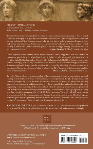 Taylor M. Weaver offers a provocative reading of Pauline community, focusing on social and historical readings of the Pauline collection, body metaphors, and socio-politics of the gift, through models and methods developed by critical theorists. Weaver pays attention to conceptual apparatuses revolving around gifting, community, and immunity found in the writings of Italian philosopher Roberto Esposito, augmenting common readings of the historical Paul, while also enriching philosophical co-optations of Paul. Using critical theories (revolving around munus/gift), Weaver unveils different gifting types, showing how these expand one’s understanding of early Christian community. The study ends with a new exegesis of 2 Corinthians 8:1–15, illuminating the text through effective theoretical avenues. This book expands methodological borders, providing innovative models of Pauline Christianity, and developing new readings of community profitable to both New Testament studies and theory.