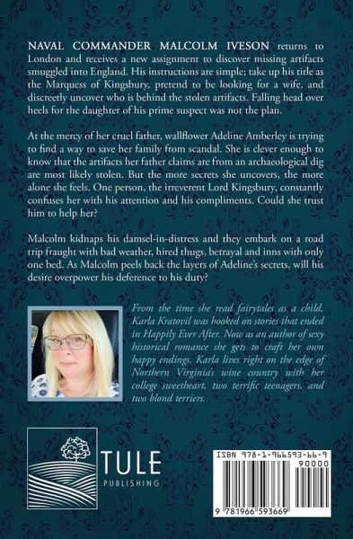 Naval Commander Malcolm Iveson returns to London and receives a new assignment to discover missing artifacts smuggled into England. His instructions are simple; take up his title as the Marquess of Kingsbury, pretend to be looking for a wife, and discreetly uncover who is behind the stolen artifacts. Falling head over heels for the daughter of his prime suspect was not the plan. At the mercy of her cruel father, wallflower Adeline Amberley is trying to find a way to save her family from scandal. She is clever enough to know that the artifacts her father claims are from an archaeological dig are most likely stolen. But the more secrets she uncovers, the more alone she feels. One person, the irreverent Lord Kingsbury, constantly confuses her with his attention and his compliments. Could she trust him to help her? Malcolm kidnaps his damsel-in-distress and they embark on a road trip fraught with bad weather, hired thugs, betrayal and inns with only one bed. As Malcolm peels back the layers of Adeline's secrets, will his desire overpower his deference to his duty?