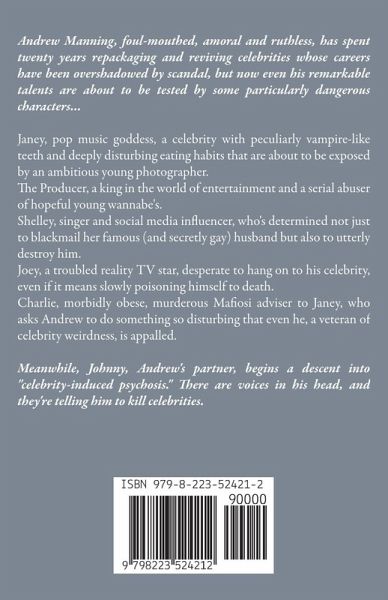 Andrew Manning, foul-mouthed, amoral and ruthless, has spent twenty years repackaging and reviving celebrities whose careers have been overshadowed by scandal, but now even his remarkable talents are about to be tested by some particularly dangerous characters... Janey, pop music goddess, a celebrity with peculiarly vampire-like teeth and deeply disturbing eating habits that are about to be exposed by an ambitious young photographer. The Producer, a king in the world of entertainment and a serial abuser of hopeful young wannabe's. Shelley, singer and social media influencer, who's determined not just to blackmail her famous (and secretly gay) husband but also to utterly destroy him. Joey, a troubled reality TV star, desperate to hang on to his celebrity, even if it means slowly poisoning himself to death. Charlie, morbidly obese, murderous Mafiosi adviser to Janey, who asks Andrew to do something so disturbing that even he, a veteran of celebrity weirdness, is appalled. Meanwhile, Johnny, Andrew's partner, begins a descent into "celebrity-induced psychosis." There are voices in his head, and they're telling him to kill celebrities.