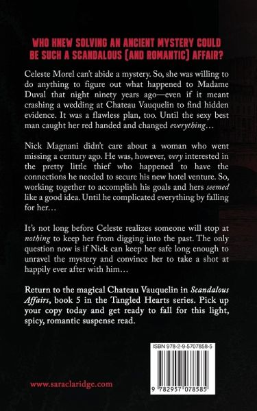 Gatecrashing a high-society wedding at Chateau Vauquelin wasn't Celeste's finest hour. Although being caught by Nick, the sexiest best man she's ever met, has its perks... Until he confiscates the hidden papers she was searching for-documents that might prove whether Madame Duval left Paris alive nearly ninety years ago, or if she was murdered by the previous owner. With just six weeks to finalise his new hotel venture before heading back to the US, the last thing Nick needs is a battle with French bureaucracy. So it's ironic that he's withholding papers from the one woman in the city who has the connections he needs to solve his problems. Not to mention that he might be falling hard for the infuriatingly headstrong biographer. As Celeste digs further into the past, it becomes clear that the papers hold the key to more than Madame Duval's disappearance. But the closer she gets to the truth, the more someone is determined to stop her-at any cost. Scandalous Affairs sees a return to Chateau Vauquelin in this standalone, suspenseful romance featuring a sinfully sexy hero, a mysterious disappearance, and a shocking secret.