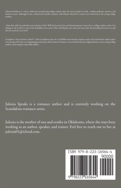 Aikaterini Roberts is a foster child and overachieving college student when she meets Joseph Caswell, a college professor, attorney, and business owner. Although he has a friend with benefits situation with Mandy Maxwell, he seems more interested in the young college student. A hot date with Caz unleashes secret desires in Kat. Will she lose her focus and determination to succeed as a college student, and is Caz willing to risk it all for a taste of her forbidden sweet treats? How will Mandy react when she learns that the friendship between Caz and Kat has reached a new level? Scandalous: Secret Desires is Book 7 of the Scandalous series. It is a 69,000-word romantic suspense and is only intended for adult readers over the age of 18, due to strong language and steamy adult content. It features a sexy and adventurous collge professor, a naive young college student, and a long list of possible stalkers.