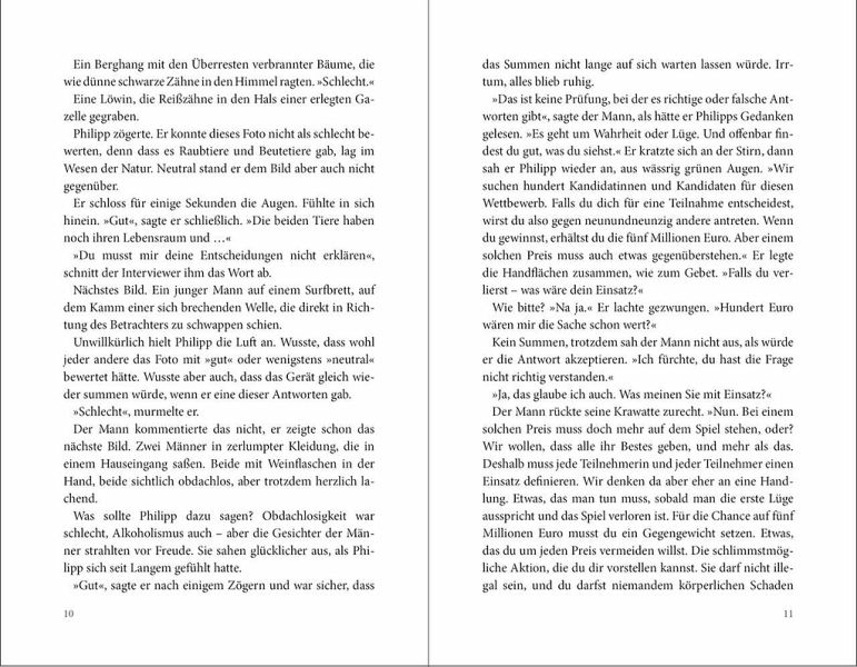 Es ist eine Challenge der besonderen Art, auf die Philipp und Tessa sich einlassen: Hundert Menschen treten an, um einen einzigartigen, unfehlbaren Lügendetektor zu testen: Scandor. Er begleitet die Kandidaten rund um die Uhr, wittert jede Ausflucht, jede Schwindelei. Wer lügt, fliegt aus dem Rennen und muss sich seinen tiefsten Ängsten stellen. Die Person hingegen, die am Ende übrigbleibt, erhält ein Preisgeld von fünf Millionen Euro.