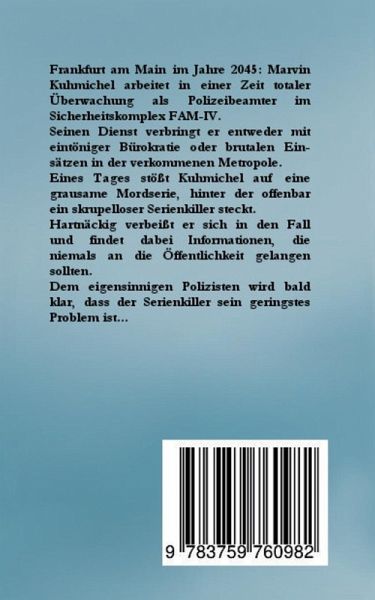 Frankfurt am Main im Jahre 2045: Marvin Kuhmichel arbeitet in einer Zeit totaler Überwachung als Polizeibeamter im Sicherheitskomplex FAM-IV. Seinen Dienst verbringt er entweder mit eintöniger Bürokratie oder brutalen Einsätzen in der verkommenen Metropole. Eines Tages stößt Kuhmichel auf eine grausame Mordserie, hinter der offenbar ein skrupelloser Serienkiller steckt. Hartnäckig verbeißt er sich in den Fall und findet dabei Informationen, die niemals an die Öffentlichkeit gelangen sollten. Dem eigensinnigen Polizisten wird bald klar, dass der Serienkiller sein geringstes Problem ist...