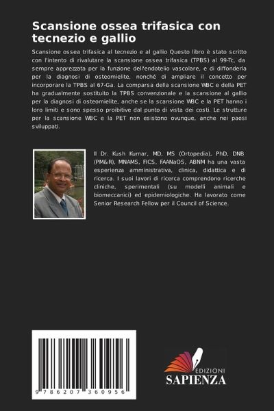 Scansione ossea trifasica al tecnezio e al gallio Questo libro è stato scritto con l'intento di rivalutare la scansione ossea trifasica (TPBS) al 99-Tc, da sempre apprezzata per la funzione dell'endotelio vascolare, e di diffonderla per la diagnosi di osteomielite, nonché di ampliare il concetto per incorporare la TPBS al 67-Ga. La comparsa della scansione WBC e della PET ha gradualmente sostituito la TPBS convenzionale e la scansione al gallio per la diagnosi di osteomielite, anche se la scansione WBC e la PET hanno i loro limiti e sono spesso proibitive dal punto di vista dei costi. Le strutture per la scansione WBC e la PET non esistono ovunque, anche nei paesi sviluppati.
