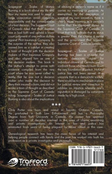 Scapegoat-The Scales of Justice Burning is a book about my life and how my name was used to assist a large corporation avoid corporate responsibility and the consequences of a bad decision. The Supreme Court of Canada ruled that their decision was in bad faith and upheld a lower court judgment of one million dollars against Pilot Insurance Company. To the surprise of the author, they also named him as a catalyst in creating a train of thought with the decision makers of Pilot Insurance Company and also aligned him as one of the decision makers. This book is the author's attempt to prove with evidence compiled from the very court where he was never called to testify, that he was not a decision maker who made the decision to deny their insured's claim, and did not evoke a train of thought as described in the Supreme Court of Canada ruling. Scapegoat-The Scales of Justice Burning is also about the implications of abusing a person's name as if it carries no meaning or purpose. As exemplified by the description of some of my own ancestors, there is clearly more meaning in a person's name than the disrespect shown by the Supreme Court of Canada. A court that truly believes that its status is greater than the citizens it serves and the government that appoints Supreme Court of Canada Justices. Scapegoat-The Scales of Justice Burning has been a crusade that restores democratic rights for individual citizens of Canada and to confront those who would burn down the very foundation of justice. Natural justice has not been served. It is uncanny that in a democratic society, there would be no mechanism in place for judicial review and correction to address an injustice whereby one's reputation is damaged by comments made by a high court.