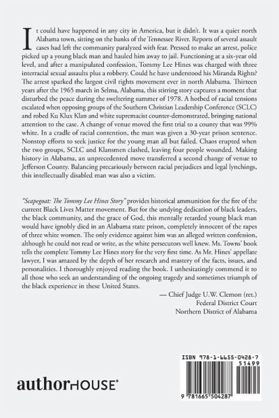 In 1978, the arrest of Tommy Lee Hines, a young black man with the mental capacity of a six-year-old, shook the city of Decatur, Alabama. This gripping story chronicles the untold narrative of an intellectually disabled man who finds himself trapped in a web of systemic racism, prejudices, and a legal system that needs reforming. As the sequence of events unfold, author Peggy Allen Towns captures the tragedy of Tommy Lee Hines that inspired a movement for change. Throughout the pages of this book, you will meet courageous and extraordinary individuals who took risks and believed it was their duty to seek justice. You also will encounter hostile counter-demonstrators and their warring tempers, as they hold on to the ideology of the "Old South." This powerful, heart-wrenching account of Decatur's Scapegoat not only explores the sacrificial offerings, but unmasks biases and inequalities that compelled the conscience of some to take progressive steps to eradicate racial injustice. The efforts of social reform advanced equal opportunities for a more unified city in the struggle of fairness for all. And the struggle continues.