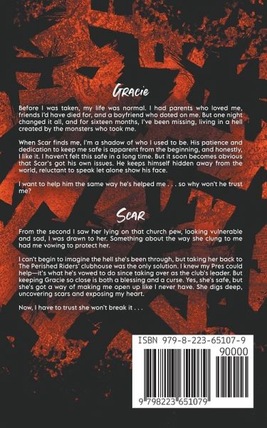Gracie Before I was taken, my life was normal. I had parents who loved me, friends I'd have died for, and a boyfriend who doted on me. But one night changed it all, and for sixteen months, I've been missing, living in a hell created by the monsters who took me. When Scar finds me, I'm a shadow of who I used to be. His patience and dedication to keep me safe is apparent from the beginning, and honestly, I like it. I haven't felt this safe in a long time. But it soon becomes obvious that Scar's got his own issues. He keeps himself hidden away from the world, reluctant to speak let alone show his face. I want to help him the same way he's helped me . . . so why won't he trust me? Scar From the second I saw her lying on that church pew, looking vulnerable and sad, I was drawn to her. Something about the way she clung to me had me vowing to protect her. I can't begin to imagine the hell she's been through, but taking her back to The Perished Riders' clubhouse was the only solution. I knew my Pres could help—it's what he's vowed to do since taking over as the club's leader. But keeping Gracie so close is both a blessing and a curse. Yes, she's safe, but she's got a way of making me open up like I never have. She digs deep, uncovering scars and exposing my heart. Now, I have to trust she won't break it . . .