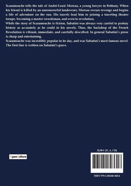 Scaramouche tells the tale of André-Louis Moreau, a young lawyer in Brittany. When his friend is killed by an unremorseful landowner, Moreau swears revenge and begins a life of adventure on the run. His travels lead him to joining a traveling theater troupe, becoming a master swordsman, and even to revolution. While the story of Scaramouche is fiction, Sabatini was always very careful to portray history as accurately as he could in his novels. Thus, the backdrop of the French Revolution is vibrant, immediate, and carefully described. In general Sabatini¿s prose is sharp and entertaining. Scaramouche was incredibly popular in its day, and was Sabatini¿s most famous novel. The first line is written on Sabatini¿s grave.