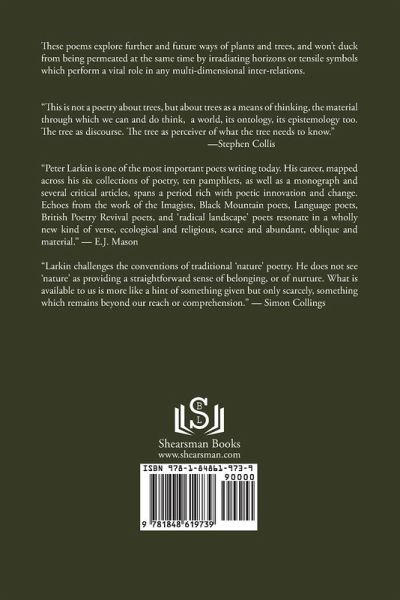 These poems explore further and future ways of plants and trees, and won't duck from being permeated at the same time by irradiating horizons or tensile symbols which perform a vital role in any multi-dimensional inter-relations. 'This is not a poetry about trees, but about trees as a means of thinking, the material through which we can and do think, a world, its ontology, its epistemology too. The tree as discourse. The tree as perceiver of what the tree needs to know.'-Stephen Collis "Peter Larkin is one of the most important poets writing today. His career, mapped across his six collections of poetry, ten pamphlets, as well as a monograph and several critical articles, spans a period rich with poetic innovation and change. Echoes from the work of the Imagists, Black Mountain poets, Language poets, British Poetry Revival poets, and 'radical landscape' poets resonate in a wholly new kind of verse, ecological and religious, scarce and abundant, oblique and material." - E.J. Mason "Larkin challenges the conventions of traditional 'nature' poetry. He does not see 'nature' as providing a straightforward sense of belonging, or of nurture. What is available to us is more like a hint of something given but only scarcely, something which remains beyond our reach or comprehension." - Simon Collings
