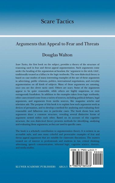 Scare Tactics, the first book on the subject, provides a theory of the structure of reasoning used in fear and threat appeal argumentation. Such arguments come under the heading of the argumentum ad baculum, the `argument to the stick/club', traditionally treated as a fallacy in the logic textbooks. The new dialectical theory is based on case studies of many interesting examples of the use of these arguments in advertising, public relations, politics, international negotiations, and everyday argumentation on all kinds of subjects. Many of these arguments are amusing, once you see the clever tactic used; others are scary. Some of the arguments appear to be quite reasonable, while others are highly suspicious, or even outrageously fraudulent. In addition to the examples taken from logic textbooks, other cases treated come from a variety of sources, including political debates, legal arguments, and arguments from media sources, like magazine articles and television ads. The purpose of this book is to explain how such arguments work as devices of persuasion, and to develop a method for analyzing and evaluating their reasonable and fallacious uses in particular cases. The book shows how such arguments share a common structure, revealing several distinctive forms of argument nested within each other. Based on its account of this cognitive structure, the new dialectical theory presents methods for identifying, analyzing, and evaluating these arguments, as they are used in specific cases.