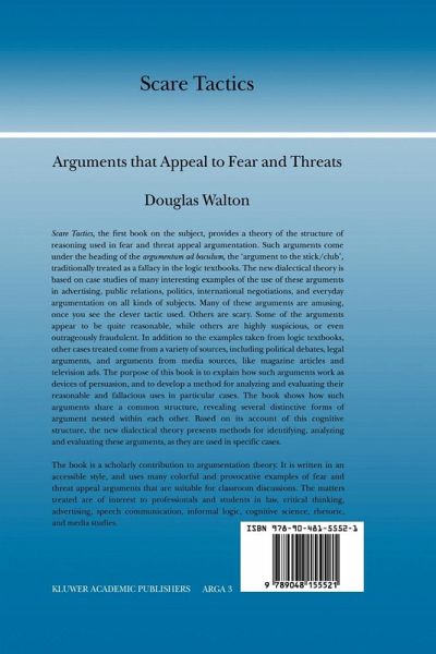 Scare Tactics, the first book on the subject, provides a theory of the structure of reasoning used in fear and threat appeal argumentation. Such arguments come under the heading of the argumentum ad baculum, the `argument to the stick/club', traditionally treated as a fallacy in the logic textbooks. The new dialectical theory is based on case studies of many interesting examples of the use of these arguments in advertising, public relations, politics, international negotiations, and everyday argumentation on all kinds of subjects. Many of these arguments are amusing, once you see the clever tactic used; others are scary. Some of the arguments appear to be quite reasonable, while others are highly suspicious, or even outrageously fraudulent. In addition to the examples taken from logic textbooks, other cases treated come from a variety of sources, including political debates, legal arguments, and arguments from media sources, like magazine articles and television ads. The purpose of this book is to explain how such arguments work as devices of persuasion, and to develop a method for analyzing and evaluating their reasonable and fallacious uses in particular cases. The book shows how such arguments share a common structure, revealing several distinctive forms of argument nested within each other. Based on its account of this cognitive structure, the new dialectical theory presents methods for identifying, analyzing, and evaluating these arguments, as they are used in specific cases.