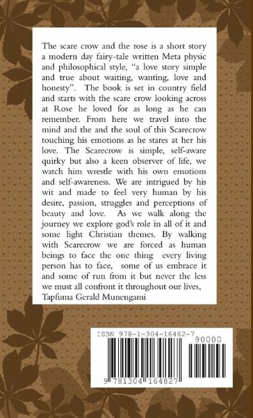 The scare crow and the rose is a short story a modern day fairy-tale written Meta physic and philosophical style, "a love story simple and true about waiting, wanting, love and honesty". The book is set in country field and starts with the scare crow looking across at Rose he loved for as long as he can remember. From here we travel into the mind and the and the soul of this Scarecrow touching his emotions as he stares at her his love. The Scarecrow is simple, self-aware quirky but also a keen observer of life, we watch him wrestle with his own emotions and self-awareness. We are intrigued by his wit and made to feel very human by his desire, passion, struggles and perceptions of beauty and love. As we walk along the journey we explore god's role in all of it and some light Christian themes.