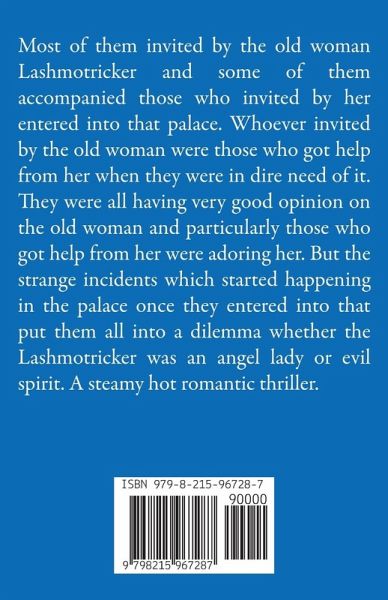 Most of them invited by the old woman Lashmotricker and some of them accompanied those who invited by her into that palace. Whoever invited by the old woman were those who got help from her when they were in dire need of it. They were all having very good opinion on the old woman and particularly those who got help from her were adoring her. The warm welcome by the old woman made them even more happy. But once they entered into the palace the trouble started. The unseen nasty creature in the palace started doing atrocities on the women there. They did not know what to do while it was satisfying its desire on one woman after the other in that palace. It was not in their dream. It was not reality either. No trace was left on the bodies of the women or otherwise that something ghastly happened on them. They just could not understand what was happening to them. Anderson Timp the psychologist among them was also in confusion. He too could not know how to take that situation. Even he did not believe in supernatural much; he could not understand how that many women were imagining in the same way. Two years back, his friend Peter who also got help from the old woman came to the palace to express his gratitude to her and disappeared. Anderson Timp got some doubts on the old woman and with the hope that he might know something, accompanied his student Stuart Zinca who was invited by the old woman, into the palace. But he could not find any proof that there was hand of Lashmotricker behind the disappearance of his friend. At the same time he could not find any proof that there was Lashmotricker behind the nasty happenings on the women in the palace. On the first day itself when he had seen Jane, he understood that she was suffering psychologically. He did not believe when she said that there was Lashmotricker's hand behind the nasty happenings in the palace. He strongly opined that her listening to the conversation between Lashmotricker and the unseen creature was just her imagination and nothing more. In between the fear and anxiety in that palace, there were love stories also. Mokall and Jane had fallen in love with each other. Stuart and Jasmine started loving each other. By the end of the novel their love had become successful. As the atrocities on the women in the palace were becoming more and more, they had to report the same to the Lashmotricker. Lashmotricker became aghast and she entrusted the responsibility to find out that nasty creature to Anderson Timp but he could not find that out. On the day after Eliza reported at the dining table about the atrocities happened on her and Jane burst out on Lashmotricker accusing her to be the cause of all the atrocities in the palace, Lashmotricker could not bear anymore. She requested all her guests to leave her palace on the coming Monday itself as they wished but not to stay even a day more after that. They felt bad when Lashmotricker died even before that Monday itself. Jane became completely bewildered and dumbfounded when she came to know that Lashmotricker bequeathed all her properties to her. None of them could understand why she bequeathed all her properties to Jane. But for all of them the confusion continued. They just could not understand what type of woman that Lashmotricker was. A steamy hot romantic thriller