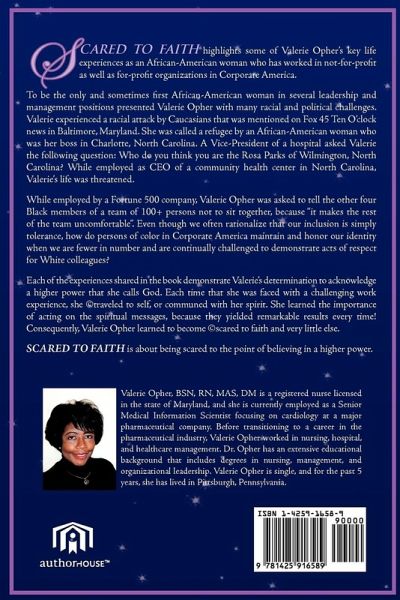 SCARED TO FAITH highlights some of Valerie Opher's key life experiences as an African-American woman who has worked in not-for-profit as well as for-profit organizations in Corporate America. To be the only and sometimes first African-American woman in several leadership and management positions presented Valerie Opher with many racial and political challenges that included the following: A racial attack by Caucasians that was mentioned on Fox 45 Ten O'clock news in Baltimore, Maryland; being called a refugee by an African-American woman who happened to be her boss in Charlotte, North Carolina; being asked: Who do you think you are, the Rosa Parks of Wilmington, NC by a Vice-President of a local hospital; and having her life threatened while employed as CEO of a community health center in North Carolina. While employed by a Fortune 500 company, Valerie Opher was asked to tell the other four Black members of a team of 100+ persons not to sit together, because "it makes the rest of the team uncomfortable". How do persons of color in Corporate America maintain and honor our identity when we are fewer in number and continually challenged to demonstrate acts of respect for White colleagues, who tend to be the majority, even though we often rationalize that our inclusion is simply tolerance? Each of the experiences shared in the book demonstrate Valerie's determination to acknowledge a higher power that she calls God. Each time that she was faced with a challenging work experience, she ©traveled to self, or communed with her spirit. She learned the importance of acting on the spiritual messages, because they yielded remarkable results every time! Consequently, Valerie Opher learned to become ©scared to faith and very little else. SCARED TO FAITH is about being scared to the point of believing in a higher power.