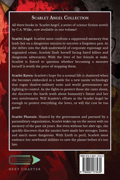 All three books in 'Scarlet Angel', a series of science fiction novels by C.A. Wilke, now available in one volume! Scarlet Angel: Scarlett must confront a suppressed memory that leads her on a dangerous mission to uncover a forgotten past. As she delves into the dark underworld of corporate espionage and organized crime, Scarlett finds herself facing hired killers and dangerous adversaries. With the lives of her friends at stake, Scarlett is forced to question whether becoming a monster herself is worth the price of stopping them. Scarlet Raven: Scarlett's hope for a normal life is shattered when she becomes embroiled in a battle for a new nanite technology that rogue shadow-military units and world governments are fighting to control. As she fights to protect those she cares about, she discovers the harsh truth about humanity's future and her own involvement. Will Scarlett's efforts as the Scarlet Angel be enough to protect everything she loves, or will the cost be too great? Scarlet Phoenix: Hunted by the government and pursued by a paramilitary organization, Scarlet wakes up on the moon with no memory of the past six years. But even without her alter ego, she quickly discovers that the nanites have made her stronger, faster, and much more dangerous. With Earth in peril, Scarlett must embrace her newfound abilities to save the planet before it's too late.