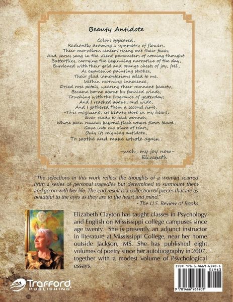 Elizabeth Clayton began teaching at the age of twenty at the University of Southern Mississippi. Presently retired, she is spending her days reviewing and preparing her works for publication. Clayton has published eighteen works (primarily poetry) since the release of her autobiography in 2007, which chronicles her struggles with bipolar disorder. In November 2012, she was inducted into the Literary Hall of Fame, Sigma Kappa Delta, and nominated for the Eric Hoffer award by her publisher in early spring 2013. She is also featured in the summer 2013 quarter of Forward Magazine, and her work, Scarlet Flow, was shown in the World Book fair in London, England in early 2013, receiving the Golden Seal of Excellence Award in 2014, following.Additionally, on January 5 and February 9, 2014, she was featured in the New York Times "New Voices, New Perspectives" segment; her most recent work, Quiet Sheba, a trilogy, begun in 2015 was completed (two final volumes) in February 2016. For this work, she received the Golden Seal of Excellence Award from her publisher. More recently, her latest work, We Lesser Gods, was published in late summer 2016, its addendum receiving the Golden Seal of Excellence Award in summer 2017.
