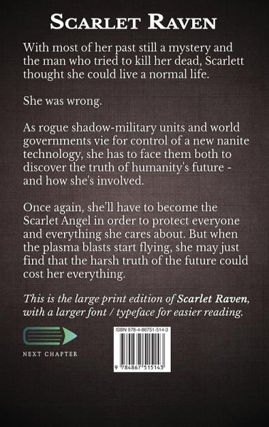 With most of her past still a mystery and the man who tried to kill her dead, Scarlett thought she could live a normal life. She was wrong. As rogue shadow-military units and world governments vie for control of a new nanite technology, she has to face them both to discover the truth of humanity's future - and how she's involved. Once again, she'll have to become the Scarlet Angel in order to protect everyone and everything she cares about. But when the plasma blasts start flying, she may just find that the harsh truth of the future could cost her everything. This is the large print edition of Scarlet Raven, with a larger font / typeface for easier reading.