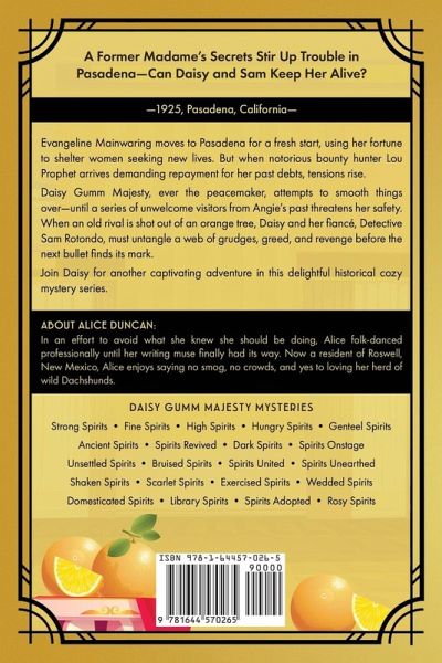When a Former Madame Bilks Bounty Hunter, Lou Prophet, Out of Money to Start a New Life, Daisy and Sam Intervene to Save Her Life in SCARLET SPIRITS, a Cozy Historical Mystery by Alice Duncan --1925, Pasadena, California-- Angie Mainwaring moves to Pasadena to start a new life and atone for her past by rescuing former "sporting" girls and housing them in a mansion in her orange grove just down the street from Daisy and her folks. Unfortunately, one of the people Angie bilked to fund her new life is notorious bounty hunter, Lou Prophet. Daisy tries to make peace between Angie and Lou but Lou's not happy. Even worse, it seems that everyone from Angie's past is coming to Pasadena to avenge their grievances against her and things get out of hand when Lou shoots one of the aggrieved out of an orange tree. Now Daisy and Sam are doing a merry dance to keep Angie alive and themselves out of trouble. Get ready for the next installment in the Daisy Gumm Majesty Mystery Series. A series which RT Book Reviews described as "Well plotted with a band of whimsical characters and genuine humor..." From the Publisher: The Daisy Gumm Majesty Cozy Mystery Series is a light-hearted mystery in a historical setting. There are no explicit sexual scenes and minimal cursing and will be enjoyed by readers who appreciate clean and wholesome reads. Fans of Peter Brandvold's, Lou Prophet, Bounty Hunter Series will enjoy meeting Lou in his later years. Readers who enjoy Carola Dunn, Amanda Quick, Elizabeth Peters, Rhys Bowen and M. Louisa Locke will not want to miss this series. "The characters come alive on the page. . . " ~Andie Senji, Verified Reviewer "Each one seems as fresh and entertaining as the first." ~Kilian, Verified Reviewer "Got the first in the series and couldn't wait to get the next. I have read them all . . ." ~Joann, Verified Reviewer "Daisy is great, I love the feel of 1920s Pasadena . . ." ~Yafa Crane Luria, Verified Reviewer "Each book gets better and better and better." ~Doobs, Verified Reviewer You can start anywhere, but you'll want to read all of the Daisy Gumm Majesty Mysteries: Strong Spirits Fine Spirits High Spirits Hungry Spirits Genteel Spirits Ancient Spirits Dark Spirits Spirits Onstage Unsettled Spirits Spirits United Spirits Unearthed Shaken Spirits Scarlet Spirits ABOUT ALICE DUNCAN: In an effort to avoid what she knew she should be doing, Alice folk-danced professionally until her writing muse finally had its way. Now a resident of Roswell, New Mexico, Alice enjoys saying no smog, no crowds, and yes to loving her herd of wild Dachshunds.