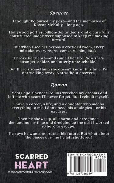 Spencer I thought I'd buried my past-and the memories of Rowan McNulty-long ago. Hollywood parties, billion-dollar deals, and a carefully constructed image were supposed to keep me moving forward. But when I see her across a crowded room, every mistake, every regret comes rushing back. I broke her heart-and ruined her life. Now she's stronger, colder, and utterly untouchable. But there's something she doesn't know: this time, I'm not walking away. Not without answers. Rowan Years ago, Spencer Collins wrecked my dreams and left me with scars I'll never forget. But I rebuilt myself. I have a career, a life, and a daughter who means everything to me. I don't need his apologies-or his excuses. Then he shows up, all charm and arrogance, demanding my time and dredging up the past I worked so hard to escape. He says he wants to protect his future. But what about the pieces of mine he left shattered?