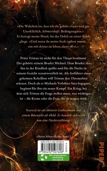 Scarred ist ein düsterer Liebesroman und der zweite, unabhängig lesbare, Teil der Never-After-Serie: einer Sammlung von gebrochenen Märchen, in denen die Bösewichte die Helden sind. Es handelt sich nicht um eine Nacherzählung. Scarred enthält Themen und Inhalte, die möglicherweise nicht für alle Leser:innen geeignet sind. Alle Warnhinweise zum Inhalt findet ihr auf der Webseite der Autorin.