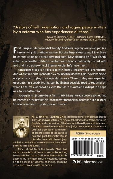 "This poignant narrative sheds light on the complexities of returning home from war and the power of resilience." -Melissa Melendez, California State Senator (Ret.), Navy Veteran ¿¿¿I've not read a debut this confident in a long, long time."-Tod Goldberg, New York Times Best-Selling Author of the Gangsterland Quartet First Sergeant John Randall "Randy" Andrews, a gutsy Army Ranger, is a hero among his brothers in arms. But the Purple Hearts and Silver Stars he earned came at a great personal cost. Now plagued by PTSD, Randy returns home after thirteen combat tours to an emotionally distant wife and their two sons-one of them a toddler he's never met. Struggling to piece his life together, Randy finds himself in handcuffs. And when the court-mandated VA counseling doesn't help, he embarks on a trip to Mexico, trying to escape his demons. There, during an unexpected encounter in a seedy tourist bar, he finds a possible road to redemption when he forms a connection with Matilda, a mountain lion kept in a cage as a tourist attraction. So begins his journey back from the brink as he rediscovers something he learned on the battlefield: that sometimes one must cross a line in order to save someone . . . perhaps even himself.