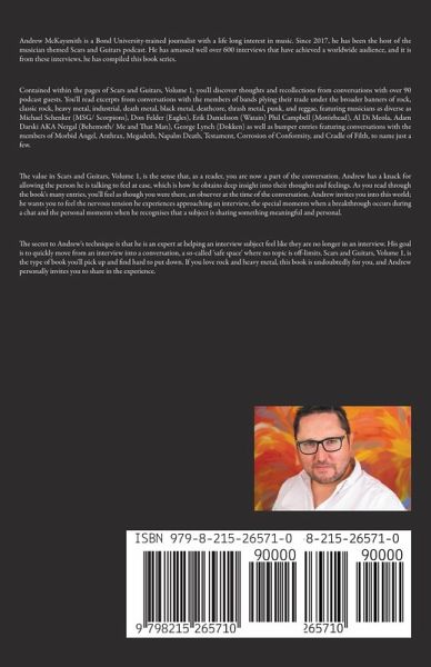 Andrew McKaysmith is a Bond University-trained journalist with a life long interest in music. Since 2017, he has been the host of the musician themed Scars and Guitars podcast. He has amassed well over 600 interviews that have achieved a worldwide audience, and it is from these interviews, he has compiled this book series. Contained within the pages of Scars and Guitars, Volume 1, you'll discover thoughts and recollections from conversations with over 90 podcast guests. You'll read excerpts from conversations with the members of bands plying their trade under the broader banners of rock, classic rock, heavy metal, industrial, death metal, black metal, deathcore, thrash metal, punk, and reggae, featuring musicians as diverse as Michael Schenker (MSG/ Scorpions), Don Felder (Eagles), Erik Danielsson (Watain) Phil Campbell (Motörhead), Al Di Meola, Adam Darski AKA Nergal (Behemoth/ Me and That Man), George Lynch (Dokken) as well as bumper entries featuring conversations with the members of Morbid Angel, Anthrax, Megadeth, Napalm Death, Testament, Corrosion of Conformity, and Cradle of Filth, to name just a few. The value in Scars and Guitars, Volume 1, is the sense that, as a reader, you are now a part of the conversation. Andrew has a knack for allowing the person he is talking to feel at ease, which is how he obtains deep insight into their thoughts and feelings. As you read through the book's many entries, you'll feel as though you were there, an observer at the time of the conversation. Andrew invites you into this world; he wants you to feel the nervous tension he experiences approaching an interview, the special moments when a breakthrough occurs during a chat and the personal moments when he recognises that a subject is sharing something meaningful and personal. The secret to Andrew's technique is that he is an expert at helping an interview subject feel like they are no longer in an interview. His goal is to quickly move from an interview into a conversation, a so-called 'safe space' where no topic is off-limits. Scars and Guitars, Volume 1, is the type of book you'll pick up and find hard to put down. If you love rock and heavy metal, this book is undoubtedly for you, and Andrew personally invites you to share in the experience.