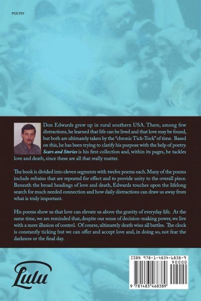 Don Edwards grew up in rural southern USA. There, among few distractions, he learned that life can be lived and that love may be found, but both are ultimately taken by the "chronic Tick-Tock" of time. Based on this, he has been trying to clarify his purpose with the help of poetry. Scars and Stories is his first collection and, within its pages, he tackles love and death, since these are all that really matter. His poems show us that love can elevate us above the gravity of everyday life. At the same time, we are reminded that, despite our sense of decision-making power, we live with a mere illusion of control. Of course, ultimately death wins all battles. The clock is constantly ticking but we can offer and accept love and, in doing so, not fear the darkness or the final day.
