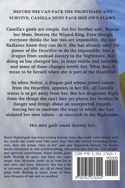 BEFORE SHE CAN FACE THE NIGHTMARE AND SURVIVE, CAMILLA MUST FACE HER OWN FLAWS. Camilla's goals are simple. Get her brother safe. Rescue her Mom. Destroy the Wizard-King. Even though everyone thinks the last two are impossible, she and Radiance know they can do it. She has already used the power of the Heartfire to do the impossible: free a dragon from undead slavery to the Nightmare. But doing so has changed her, in ways visible and invisible, and some of those changes terrify her. What does it mean to be herself when she is part of the Heartfire? So when Nelexi, a dragon god whose power comes from the Heartfire, appears in her life, all Camilla wants is to get away from her. But her desperate flight from the things she can't face yet places her brother in danger and brings about an unexpected tragedy, forcing her to confront the ways in which she has violated her own values - or succumb to the Nightmare. Her own guilt could destroy her.