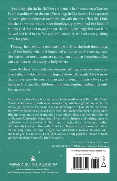 Lyndie thought she had left her problems in her hometown of Upstate South Carolina when she ran off to college in Charleston. She expected to have a great senior year and move on with the rest of her life. Little did she know, she would meet Brantley, a guy who had the kind of faith in God she had never known. He would challenge her own faith in God and lead her to face a painful memory she had been pushing away for years. Through her newfound relationship with God, she finds the courage to tell her family what had happened to her so many years ago, and she learns that not all scars are permanent and that sometimes, God can use them to tell a story to help others. Scars that Heal is a story that encourages and inspires and encompasses love, faith, and the devastating impact of sexual assault. This is more than a love story between a man and a woman; this is a love story between God and His children and the redeeming healing that only He can provide.