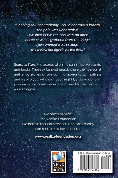 "Sobbing so uncontrollably I could not take a breath, the pain was unbearable. I washed down the pills with an open bottle of wine I grabbed from the fridge. I just wanted it all to stop... The pain... the fighting... the lies..." Scars to Stars TM is a series of online summits, live events, and books. These writers vulnerably share their personal, authentic stories of overcoming adversity to motivate and inspire you, wherever you might be along our own journey... so you will never again need to feel alone in your struggle. Proceeds benefit: The Realize Foundation We believe that conversation and community can reduce suicide statistics. www.realizefoundation.org