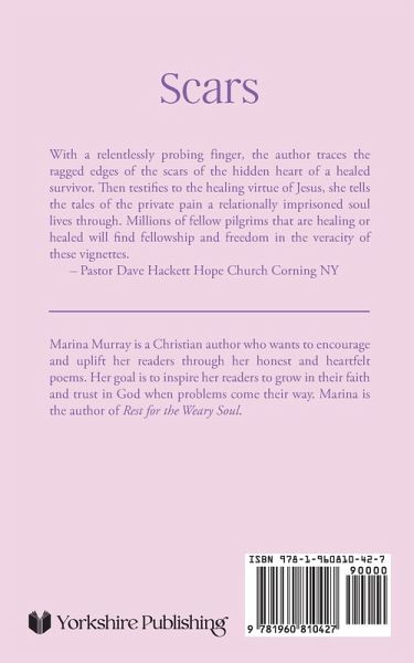 Marina Murray in her second book, Scars, takes readers on a journey into the past. A past where she endured the pain and suffering that an abusive marriage can produce. The scars are real, but Marina is a survivor. She wants to encourage her readers that there is hope as well as healing on the other side of abusive relationships. Marina is also the author of Rest for the Weary Soul.