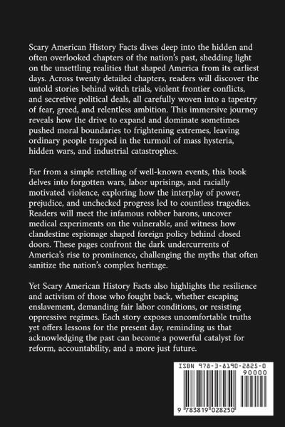 Scary American History Facts dives deep into the hidden and often overlooked chapters of the nation's past, shedding light on the unsettling realities that shaped America from its earliest days. Across twenty detailed chapters, readers will discover the untold stories behind witch trials, violent frontier conflicts, and secretive political deals, all carefully woven into a tapestry of fear, greed, and relentless ambition. This immersive journey reveals how the drive to expand and dominate sometimes pushed moral boundaries to frightening extremes, leaving ordinary people trapped in the turmoil of mass hysteria, hidden wars, and industrial catastrophes.Far from a simple retelling of well-known events, this book delves into forgotten wars, labor uprisings, and racially motivated violence, exploring how the interplay of power, prejudice, and unchecked progress led to countless tragedies. Readers will meet the infamous robber barons, uncover medical experiments on the vulnerable, and witness how clandestine espionage shaped foreign policy behind closed doors. These pages confront the dark undercurrents of America's rise to prominence, challenging the myths that often sanitize the nation's complex heritage.Yet Scary American History Facts also highlights the resilience and activism of those who fought back, whether escaping enslavement, demanding fair labor conditions, or resisting oppressive regimes. Each story exposes uncomfortable truths yet offers lessons for the present day, reminding us that acknowledging the past can become a powerful catalyst for reform, accountability, and a more just future.