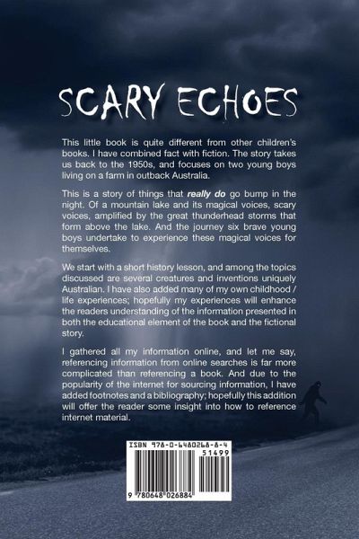 This little book is quite different from other children's books. I have combined fact with fiction. The story takes us back to the 1950's, and focuses on two young boys living on a farm in outback Australia. This is a story of things that really do go bump in the night. Of a mountain lake and its magical voices, scary voices, amplified by the great thunderhead storms that form above the lake. And the journey six brave young boys undertake to experience these magical voices for themselves. We start with a short history lesson, and among the topics discussed are several creatures and inventions uniquely Australian. I have also added many of my own childhood / life experiences; hopefully my experiences will enhance the readers understanding of the information presented in both the educational element of the book and the fictional story. I gathered all my information online, and let me say, referencing information from online searches is far more complicated than referencing a book. And due to the popularity of the internet for sourcing information, I have added footnotes and a bibliography; hopefully this addition will offer the reader some insight into how to reference internet material.