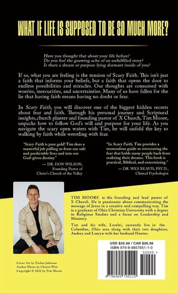 WHAT IF LIFE IS SUPPOSED TO BE SO MUCH MORE? Have you thought that about your life before? Do you feel the gnawing ache of an unfulfilled story? Is there a dream or purpose lying dormant inside of you? If so, what you are feeling is the tension of scary faith. This isn't just a faith that informs your beliefs, but a faith that opens the door to endless possibilities and miracles. Many of us have fallen for the lie that having faith means having no doubt or fear. Our thoughts are consumed with worries, insecurities, and uncertainties. Yet, no matter how hard we try to muster faith, we just can't seem to take that step. We give up before we grow up and never take our first step to pursue our dreams and callings. In Scary Faith, you will discover one of the biggest hidden secrets about fear and faith. Through his personal journey and Scriptural insights, church planter and founding pastor of X Church, Tim Moore, unpacks how to follow God's will and purpose for your life. As you navigate the scary open waters with Tim, he will unfold the key to walking by faith while wrestling with fear. In Scary Faith, you will learn how to: · Recognize the voice of God · Find your purpose and calling · Discern God's will for your life · Override your natural response to fear · Experience miracles in your life Whether you are a stay-at-home mom, an entrepreneur, a pastor, or a college student, all of us have God-given dreams yet to be fulfilled. The real question is whether you will settle in the plains of comfort or adventure by faith into your destiny.