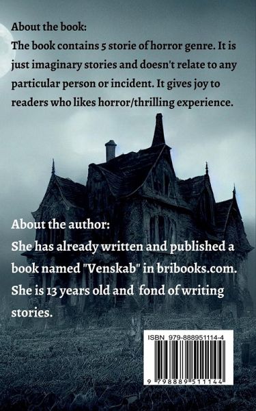 This book contains five different horror genre stories. The story is about Saara and Lucy. Lucy takes vengeance against her stepmother for her evil character but doesn't hurt Saara and becomes her saviour. Another story is about problems faced by Beccy and her friends during their adventure trip. How they overcame their problems with the help of their parents and others? Each story is different from the other story.