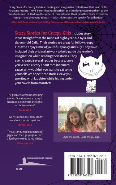 Scary Stories for Creepy Kids includes story ideas straight from the minds of eight-year-old Ayla and six-year-old Calla. Their stories are great for fellow creepy kids who enjoy a mix of youthful spooky and silly. They have included their original artwork to help guide the reader's imagination while reading their stories. They even created several recipes because, once you've read a story about toes in tomato sauce, why wouldn't you want to eat some yourself! We hope these stories leave you snorting with laughter while hiding under your covers from monsters.