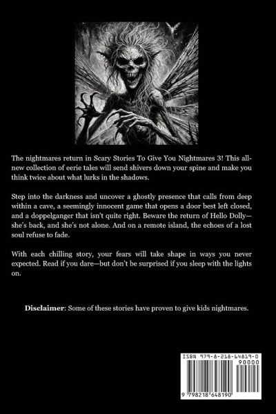 The nightmares return in Scary Stories To Give You Nightmares 3! This all-new collection of eerie tales will send shivers down your spine and make you think twice about what lurks in the shadows. Step into the darkness and uncover a ghostly presence that calls from deep within a cave, a seemingly innocent game that opens a door best left closed, and a doppelganger that isn't quite right. Beware the return of Hello Dolly-she's back, and she's not alone. And on a remote island, the echoes of a lost soul refuse to fade. With each chilling story, your fears will take shape in ways you never expected. Read if you dare-but don't be surprised if you sleep with the lights on.