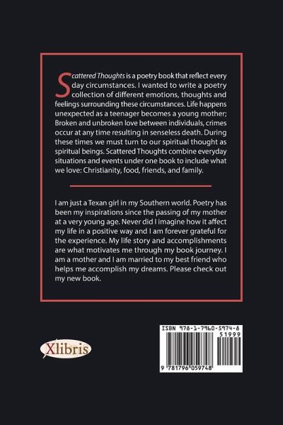 Scattered Thoughts is a poetry book that reflect every day circumstances. I wanted to write a poetry collection of different emotions, thoughts and feelings surrounding these circumstances. Life happens unexpected as a teenager becomes a young mother; Broken and unbroken love between individuals, crimes occur at any time resulting in senseless death. During these times we must turn to our spiritual thought as spiritual beings. Scattered Thoughts combine everyday situations and events under one book to include what we love: Christianity, food, friends, and family.