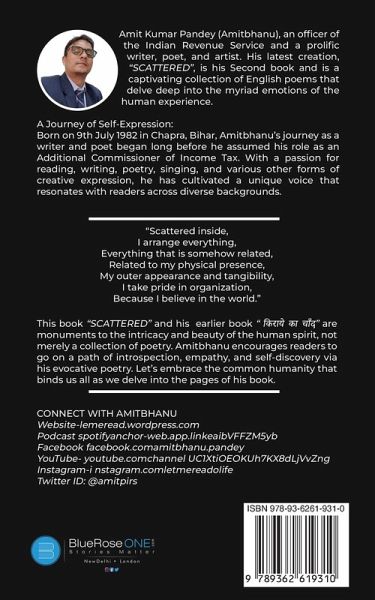 "SCATTERED" is a captivating collection of English poems that delve deep into the myriad emotions of the human experience. Poems in SCATTERED are humane and mostly dwell inward rather than outward on philosophical, psychological, spiritual, social, environmental, etc. areas of our lives. The various aspects of life are the subject matters of the poems in the book and SCATTERED has nothing to do with any particular person, animal, or thing. The nature of the poems are universal subjects common to every man, woman, animal, plant, and other living/non-living components of our beautiful world. You will find that the language of the poems is lucid and the words used are mostly simple and commonly used in daily communication. Everything in these poems is nothing but the emotions, thought processes, and concerns of us all based on my personal experience and thinking. The poems are based on triggering moments, emotions, incidents, and observations and are written spontaneously.