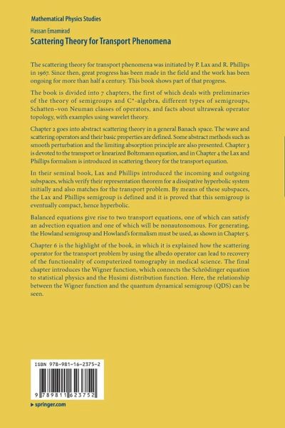 The scattering theory for transport phenomena was initiated by P. Lax and R. Phillips in 1967. Since then, great progress has been made in the field and the work has been ongoing for more than half a century. This book shows part of that progress.