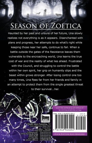 Haunted by her past and unsure of her future, Una slowly realizes not everything is as it appears. Disenchanted with plans and progress, her attempts to do what's right while keeping those near her safe, continue to fail. When a battle outside the gates of the Resistance leaves them vulnerable to the encroaching world, Una learns the true cost of war and the reality of what lies ahead. Frustrated with the Council, and struggling to control the battle within her own spirit, her grip on humanity slips and the beast within grows stronger. After losing control one too many times, Una flees far from her friends and family in an attempt to protect them from the single greatest threat to their survival...her.