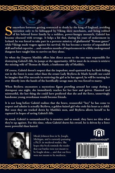 Somewhere between getting sentenced to death by the king of England, avoiding execution only to be kidnapped by Viking slave merchants, and being robbed of his beloved foster family by a ruthless, power-hungry monarch, Gabriel has become obsessed with revenge. It helps a bit that, during his years of enslavement in Iceland, he was forced to take part in a perverse mimicry of gladiatorial "Roman games" while Vikings made wagers against his survival. He has become a warrior of unparalleled skill and lethal expertise .and countless months of imprisonment in a filthy underground dungeon have taught him to survive on fury alone. So when the Empress Matilda offers him direct access to the one man responsible for destroying Gabriel's life, he jumps at the opportunity. All he must do in return is retrieve the missing wife of Thomas de Marle, a loathsome ally of Matilda's. Of course, Gabriel doesn't suspect that the impudent, mud-spattered boy he finds hiding out in the forest is none other than the errant Lady Brylieva de Marle herself; nor could he imagine that if he succeeds in retrieving the girl as he has agreed, he will be turning her over directly into the hands of the horrifically savage man she was forced to marry. When Brylieva encounters a mysterious figure prowling around her camp during a downpour one night, she immediately reaches for her bow and quiver. Haunted and mistrustful, the last thing she could have predicted that she and the fierce, unnervingly handsome young swordsman would become friends. It is not long before Gabriel realizes that the brave, resourceful "boy" he has come to respect and admire is actually Brylieva, a golden-haired girl who stole his heart as a child. But soon they are tracked down by Matilda's men, and Brylieva allows herself to be captured in hopes of saving Gabriel's life. As usual, Gabriel is outnumbered by is enemies; and as usual, they have no idea what they're up against. For this time, when Gabriel draws his sword, he is