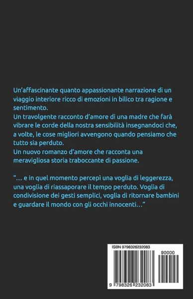 Un'affascinante quanto appassionante narrazione di un viaggio interiore ricco di emozioni in bilico tra ragione e sentimento. Un romanzo che indaga e mostra le debolezze contemporanee, mette in risalto quanto sia fragile la normalità. Un travolgente racconto d'amore di una madre che farà vibrare le corde della nostra sensibilità insegnandoci che, a volte, le cose migliori avvengono quando pensiamo che tutto sia perduto. Un nuovo romanzo d'amore che racconta un incontro di destini, vicende differenti ma che hanno un denominatore comune: una meravigliosa storia traboccante di passione. "... e in quel momento percepì una voglia di leggerezza, una voglia di riassaporare il tempo perduto. Voglia di condivisione dei gesti semplici, voglia di ritornare bambini e guardare il mondo con gli occhi innocenti..."