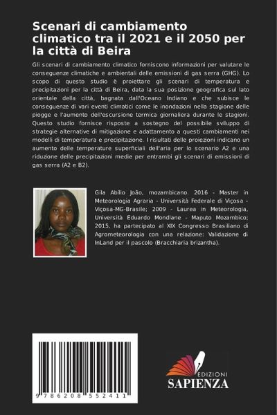 Gli scenari di cambiamento climatico forniscono informazioni per valutare le conseguenze climatiche e ambientali delle emissioni di gas serra (GHG). Lo scopo di questo studio è proiettare gli scenari di temperatura e precipitazioni per la città di Beira, data la sua posizione geografica sul lato orientale della città, bagnata dall'Oceano Indiano e che subisce le conseguenze di vari eventi climatici come le inondazioni nella stagione delle piogge e l'aumento dell'escursione termica giornaliera durante le stagioni. Questo studio fornisce risposte a sostegno del possibile sviluppo di strategie alternative di mitigazione e adattamento a questi cambiamenti nei modelli di temperatura e precipitazione. I risultati delle proiezioni indicano un aumento delle temperature superficiali dell'aria per lo scenario A2 e una riduzione delle precipitazioni medie per entrambi gli scenari di emissioni di gas serra (A2 e B2).