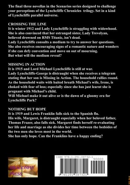 The final three novellas in the Scenarios series CROSSING THE LINE Lady Lynchcliffe is struggling with widowhood. She is also convinced that her estranged sister, Lady Trevelyan, believed drowned on RMS Titanic, isn't dead. She consults a medium to try to answer her questions. But what will the medium reveal? MISSING IN ACTION It is 1915 and Lord Lynchcliffe is at war. Lady Lynchcliffe-George is distraught when she receives a telegram stating that her son is Missing in Action. Michael's wife, Irene, is choked with fear of loss; especially since she has just learnt she is carrying Michael's child. Will Michael make it out alive? NOTHING BUT HOPE It is 1919 and Lewis Franklin falls sick with the Spanish flu. His wife, Margaret, is distraught especially when her beloved father, Thomas Frazer, also falls sick. She has only hope. Can the Franklins have a happy ending?