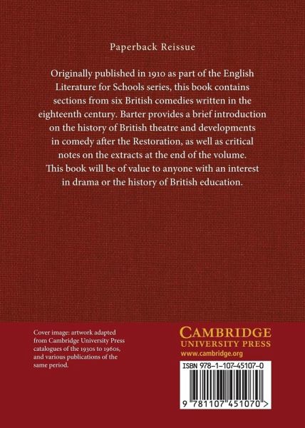 Originally published in 1910 as part of the English Literature for Schools series, this book contains sections from six British comedies written in the eighteenth century. Barter provides a brief introduction on the history of British theatre and developments in comedy after the Restoration, as well as critical notes on the extracts at the end of the volume. This book will be of value to anyone with an interest in drama or the history of British education.