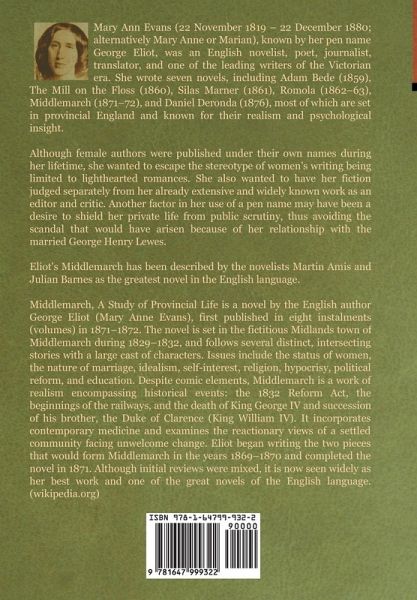 Mary Anne (alternatively Mary Ann or Marian) Evans (22 November 1819 - 22 December 1880), better known by her pen name George Eliot, was an English novelist, journalist and translator, and one of the leading writers of the Victorian era. She is the author of seven novels, including Adam Bede (1859), The Mill on the Floss (1860), Silas Marner (1861), Middlemarch (1871-72), and Daniel Deronda (1876), most of them set in provincial England and well known for their realism and psychological insight. Scenes of Clerical Life is the title under which George Eliot's first published fictional work, a collection of three short stories, was released in book form, and the first of her works to be released under her famous pseudonym. The stories were first published in Blackwood's Magazine over the course of the year 1857, initially anonymously, before being released as a two-volume set by Blackwood and Sons in January 1858. The three stories are set during the last twenty years of the eighteenth century and the first half of the nineteenth century over a fifty year period. The Stories take place in and around the fictional town of Milby in the English Midlands. Each of the Scenes concerns a different Anglican clergyman, but is not necessarily centred upon him. Eliot examines, among other things, the effects of religious reform and the tension between the Established and the Dissenting Churches on the clergymen and their congregations, and draws attention to various social issues, such as poverty, alcoholism, and domestic violence. (wikipedia.org)